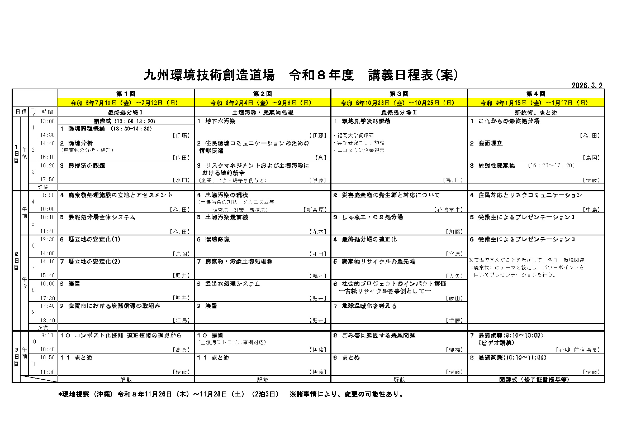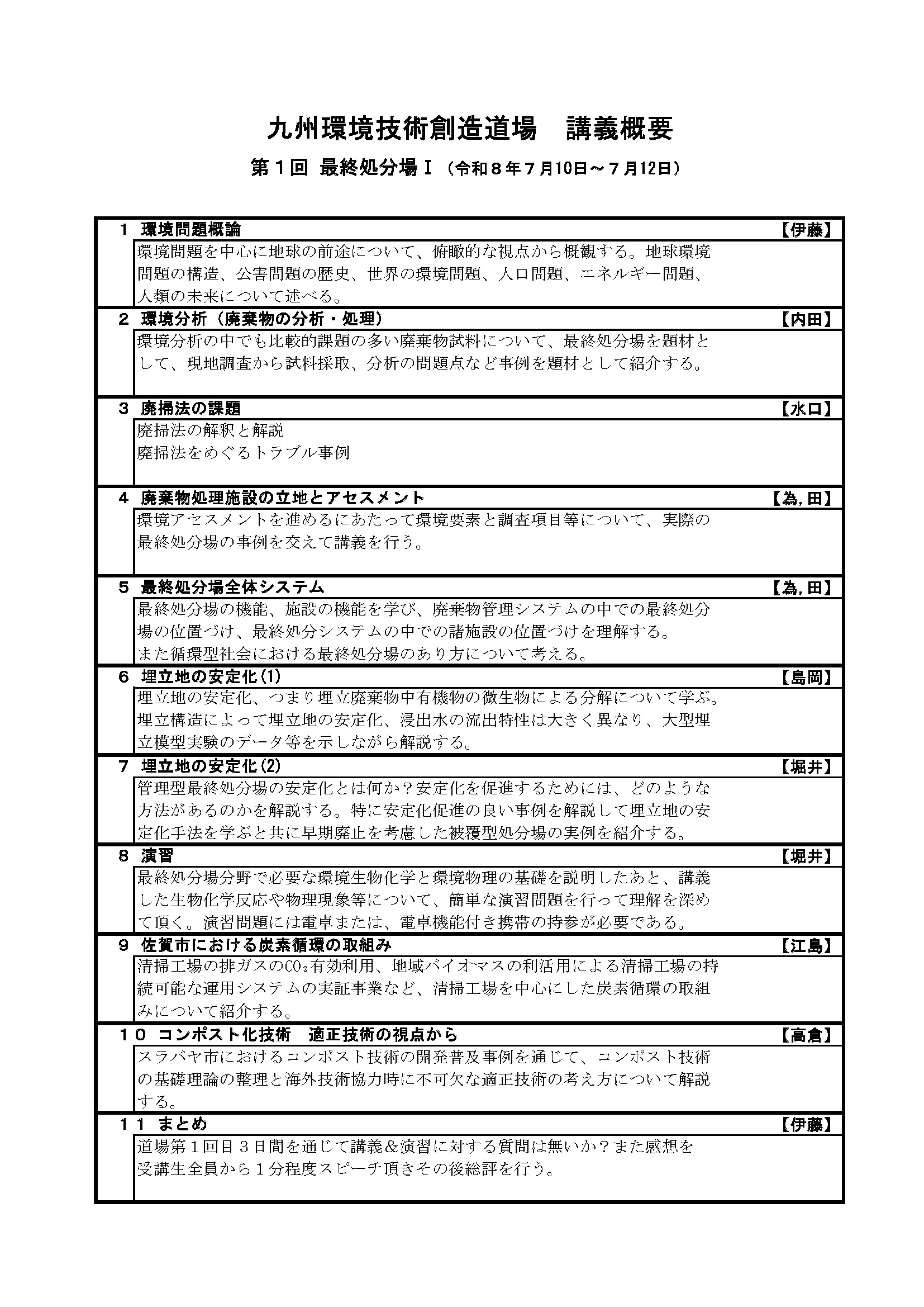 九州環境技術創造道場 令和8年度 講義日程表